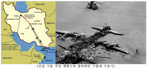 1980 년 4 월 24 일 미국은 인질 구출 작전(작전명: Operation Eagle Claw)을 개시하였다. 작전 계획은 8 대의 헬리콥터와 급유 및 특공대 수송 업무를 맡은 C-130 수송기 4 대로 구성된 침투팀이 중부 이란 사막에서 접선하여 침투 거점(Desert One)을 설치하고 급유 받은 헬리콥터가 테헤란 인근으로 특공대를 수송하면 미리 대기하고 있던 CIA 요원의 안내 아래 트럭을 이용하여 테헤란 이란 대사관을 습격한 후 시설을 장악하고 인질 신병을 확보하는 한편 같은 시간에 별도의 특수 부대와 수송기로 구성된 구출팀이 테헤란 인근 공항에 낙하하여 공항을 접수하고 인질 수송용 항공기를 착륙 시켜 인질 탑승 후 탈출한다는 것이었다. 그러나 헬리콥터 중 2 대는 침투 거점에 도착하지도 못했으며 1대는 도착 후 작전 불능 상태가 되어 작전 수행에 필요한 최소한의 헬기(6 대) 확보가 어렵게 되었다. 결국 작전 진행을 포기하고 철수 명령을 내렸으나 급박한 상황에서 재급유가 진행되는 도중 헬기 1 대가 급유기에 지나치게 근접하다가 충돌하는 사고가 발생하였다. 헬기와 급유기는 전소되었고 8 명의 부대원이 소사(燒死)하였으나 미군은 시신도 수습하지 못한 채 서둘러 탈출해야 했다.
